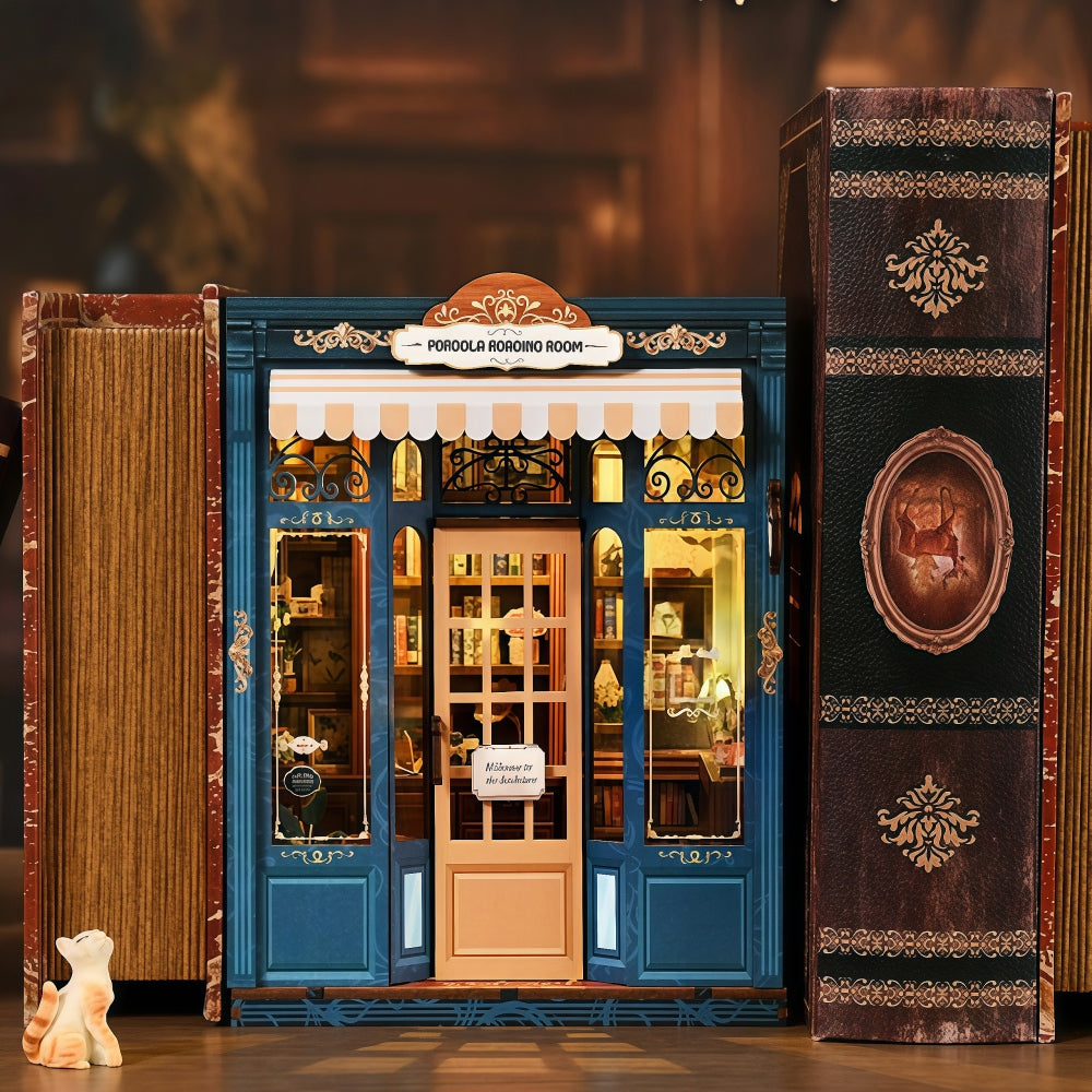 Welcome to The Pergola Reading Room, a cozy, miniature bookshop plucked straight from a charming European street corner. This model is a tribute to the quiet joy of browsing through old books and the warm, inviting glow of a neighborhood sanctuary. The deep navy blue facade and the striped awning evoke a classic Victorian-era aesthetic, while the elegant wooden window frame suggests a love for nature and the outdoors. As you meticulously construct the tiny display shelves, the stacks of books, and the delicate door, you're not just assembling wood; you are becoming the proud proprietor of this beautiful, illuminated haven. It’s a perfect piece for anyone who dreams of owning a little shop where time slows down and every volume holds a new adventure.
