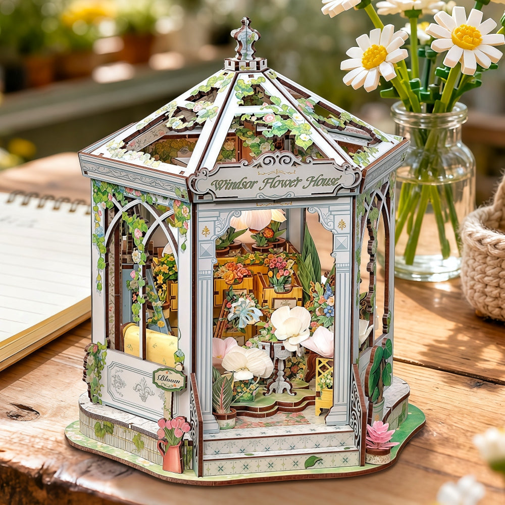 This exquisite 3D wooden puzzle captures a romantic moment frozen in time. Featuring a beautifully detailed hexagonal gazebo adorned with climbing vines and blooming flowers, the center reveals a charming newlywed couple surrounded by their very own lush floral shop.