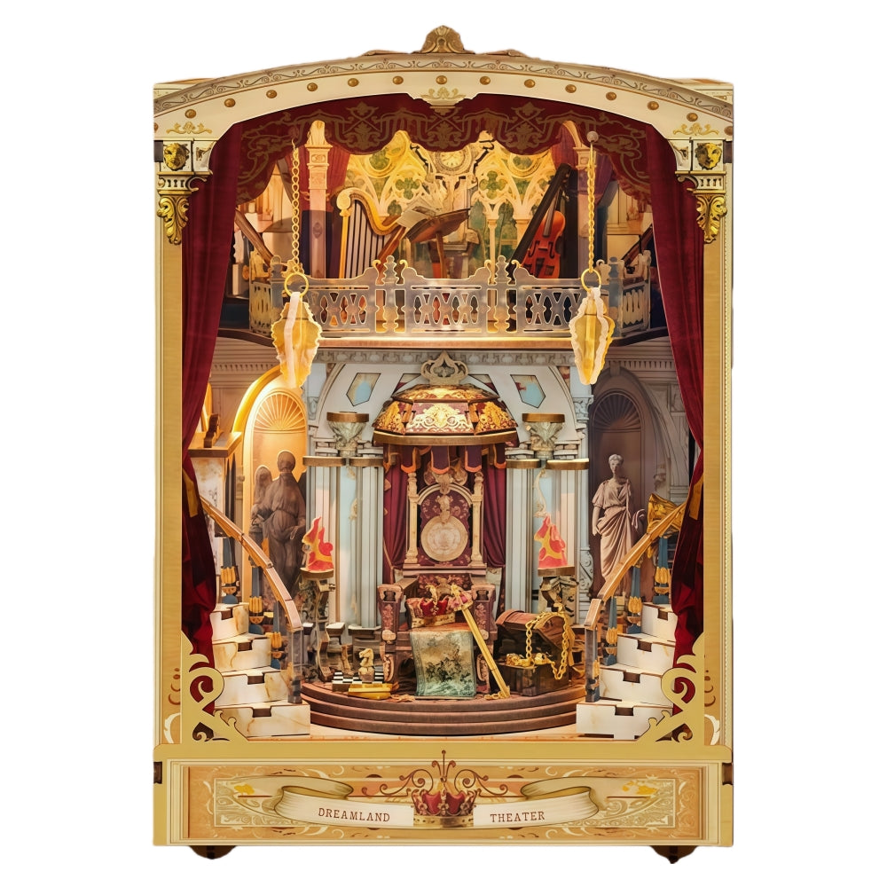 The velvet curtains rise on a world of golden echoes. The Dreamland Theater is a miniature stage where classic elegance meets mechanical magic. Step into a realm of marble statues, crimson drapes, and the silent melodies of a phantom orchestra.